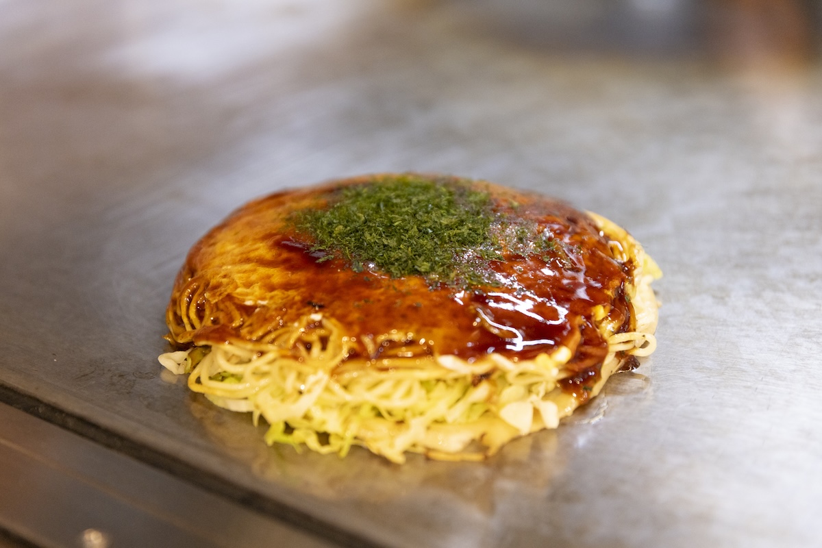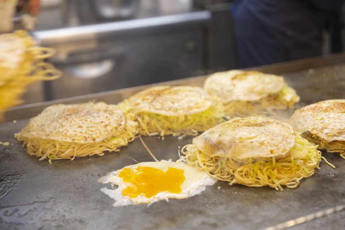 薄く伸ばした生地の上に、キャベツを山盛りに重ね、さらに豚肉などの具材をのせていきます。ひっくり返して焼いていくと、生地が蓋となって下で蒸されたキャベツの甘みが引き出されていきます。最後にそばを敷き、その上に具材をのせ卵を重ねて、鉄板の上でひとつの円に仕上げます。