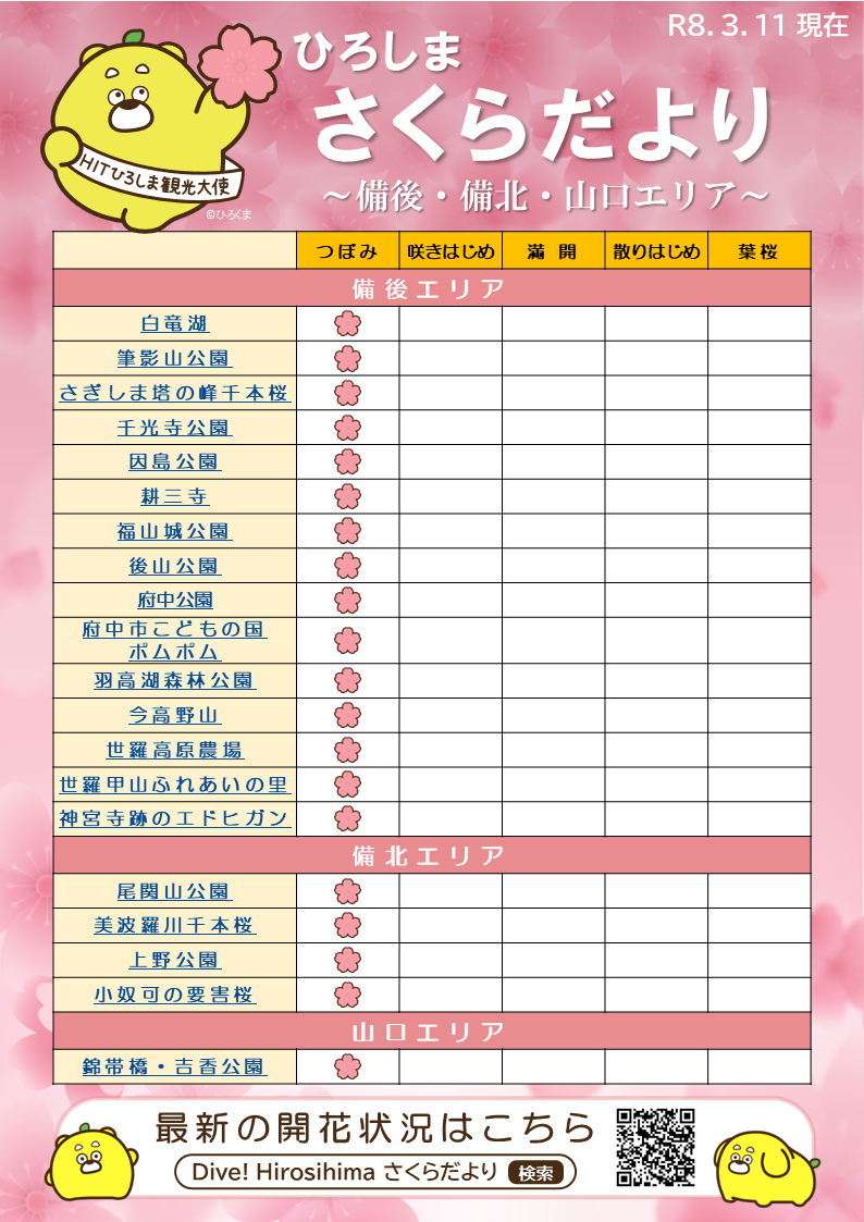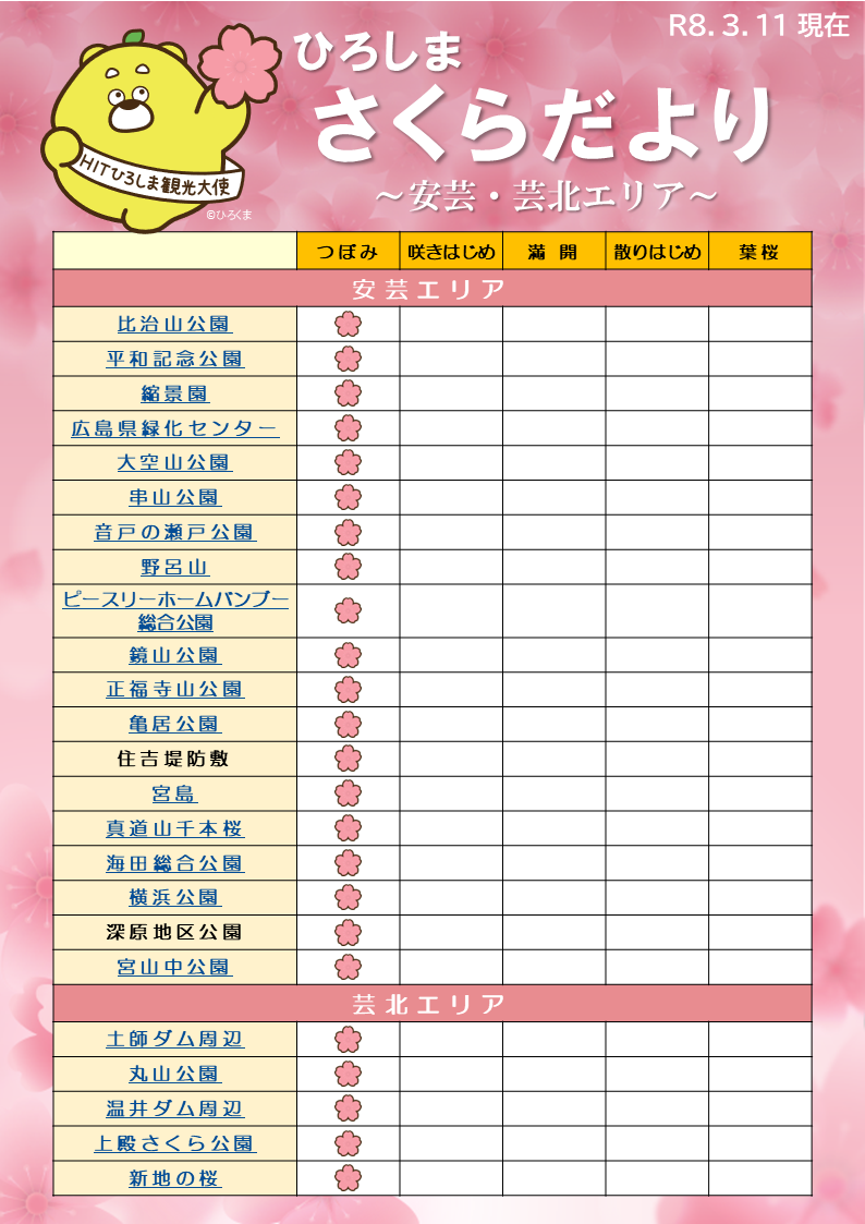 HOME新着情報2026.03.13 / 2026.03.13 Updateひろしま さくらだより(2026.3.11現在)#注目ひろしま さくらだより(2026.3.11現在)4月10 日(金)までの期間、毎週金曜日に県内を中心とした桜の名所44ヶ所の開花状況をお知らせします! 施設詳細はPDFファイルよりご覧いただけます。 『ひろしま さくらだより』一覧表はこちら※調査時の情報です。最新情報についてはお出かけされるスポットに直接ご連絡いただき、ご確認ください。『ひろしま さくらだより』一覧表(2026.3.11現在) (PDF/0.494MB)桜の名所マップ おすすめ桜特集・桜まつり広島の桜の名所・お花見スポットまとめ夜桜・一本桜・桜まつり特集千光寺公園の花見世羅甲山ふれあいの里 桜まつり常國寺二引両桜まつり関連する記事HITひろしま観光大使「ひろくま」 書籍化決定!県立広島大学が地方創生コンテストで優秀賞受賞!企画ツアー「歴史薫る白市の町家で楽しむ おひな祭りと白市紅茶のティータイム」催行決定TSS「西村キャンプ場」で「芸備線沿線めぐり旅」を放送します!!「ひろくま電車」の運行を開始します!(広島駅 ~ 広電宮島口)この記事をシェアする